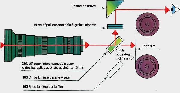 Un miroir placé à 45° sur l’obturateur à guillotine dirige alternativement toute la lumière sur le film et dans le viseur.