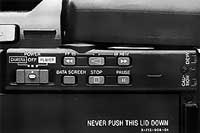 Confiées à un large écran de contrôle à cristaux liquides, disposé sur le côté gauche du camescope, toutes les informations concernant le fonctionnement de l’appareil se retrouvent dans le viseur électronique. Un véritable tableau de bord où viennent s’inscrire, en surimpression, tous les paramètres à connaître : le type de mise au point, la commande de diaphragme, la balance des blancs, le compteur de bande, la fonction mémoire, le mode de défilement, la vitesse d’ obturation, la date, l’heure, le titre choisi, la couleur d’accompagnement, le mode d’incrustation, l’état de la batterie, la fin ou l’absence de cassette, la pause, le ralenti et l’arrêt sur image. Sans oublier la présence d’humidité ou l’encrassement des têtes vidéo ! L’indication de ra vitesse de défilement choisie s’affiche elle aussi (SP ou LP). La sélection dépend d’un petit curseur linéaire, placé dans le compartiment de la pile au lithium qui alimente l’horodateur et maintient en mémoire les signaux destinés à l’incrustation des deux pages de titres. Une nouveauté : le sélecteur de vitesse n’est pas combiné avec la fonction « Edit », dont le rôle est de compenser les pertes affectant les signaux au montage. En effet, cette correction est assurée à partir d’un curseur séparé dont l’usage n’est toutefois conseillé que pour la copie car elle souligne le contour des images.